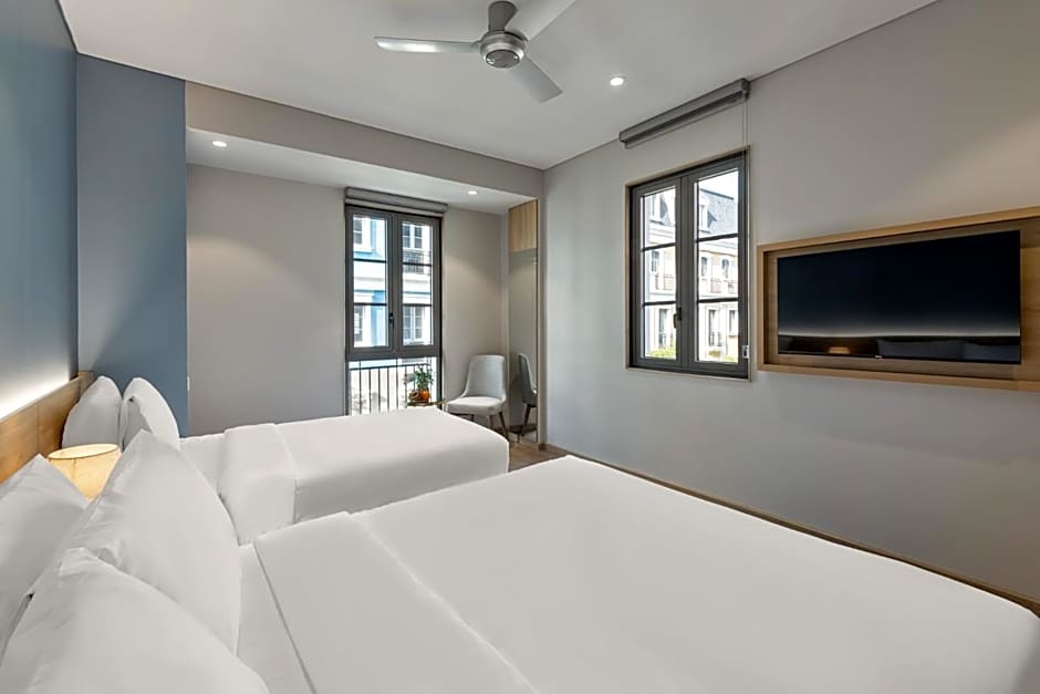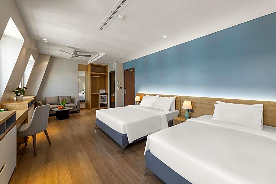 Room choices cover a range from the compact Superior with a Queen bed and no window to Deluxe with a window for two. For families and groups, options include Family with Window (377 sqft) featuring a King bed, and Family Suite (377 sqft) with additional sleeping arrangements. The Suite measures 484 sqft and blends a Double bed with two Twin beds. Premier Deluxe configurations offer two Twin beds or a Twin plus Queen setup, while a Triple Premier Deluxe combines a Twin with a Queen for three guests.